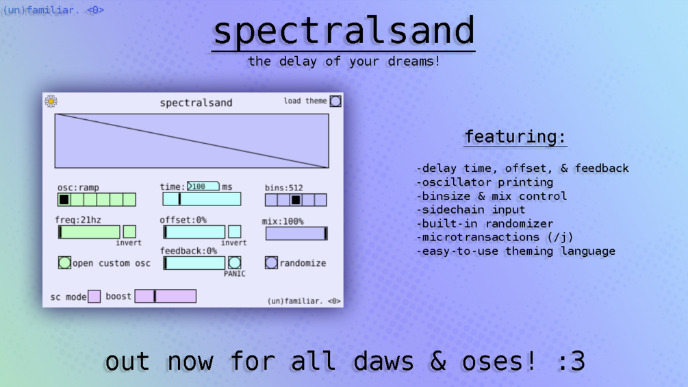 essentially, spectralsand can break down the frequency spectrum into hundreds of tiny bits, changing the delay time and volume of each one. this allows it to completely change the timbre of whatever it's fed; but it gets better, because the delay and volume are organized in a graph that can be manipulated by a whole host of sources! you can use basic shapes, white noise, custom waveforms, and even a separate audio input! this unlocks strange new ways to make lasery noises, beautiful soundscapes, wet swampy sounds, and whatever else you can imagine.